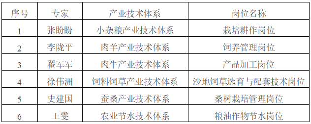 张盼盼教授入选小杂粮产业技术体系岗位专家、李陇平副教授入选肉羊产业技术体系岗位专家(饲养管理岗位)、翟军军副教授入选肉牛产业技术体系岗位专家(产品加工岗位)、徐伟洲教授入选饲料饲草产业技术体系岗位专家(沙地饲草选育与配套技术岗位)、史建国教授入选蚕桑产业技术体系岗位专家(桑树栽培管理岗位)、王雯教授入选农业节水技术体系岗位专家(粮油作物节水岗位)。